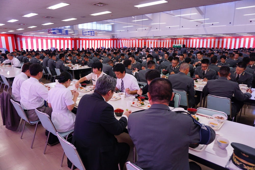その後、食堂で卒業記念会食を全校生徒と一緒に食べました。在校生は防衛大学校と大学卒業した幹部候補生ばかりです。意外と眼鏡をかけている学生が多いように感じます。訓話や送辞や答辞の後は、麦茶で乾杯をして定番の赤飯とエビフライの食事になりました。